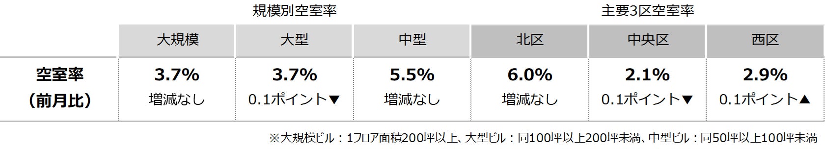 空室率は前月比プラス0.01ポイントの3.70%と、前月からほぼ横ばいとなった。新築ビルへ移転したテナントの二次空室や部分解約で現空床が生じたものの、新規開設や拡張移転等で空室の消化が進み、前月からはわずかな動きとなった。潜在空室率は前月比プラス0.03ポイントの5.37%だった。