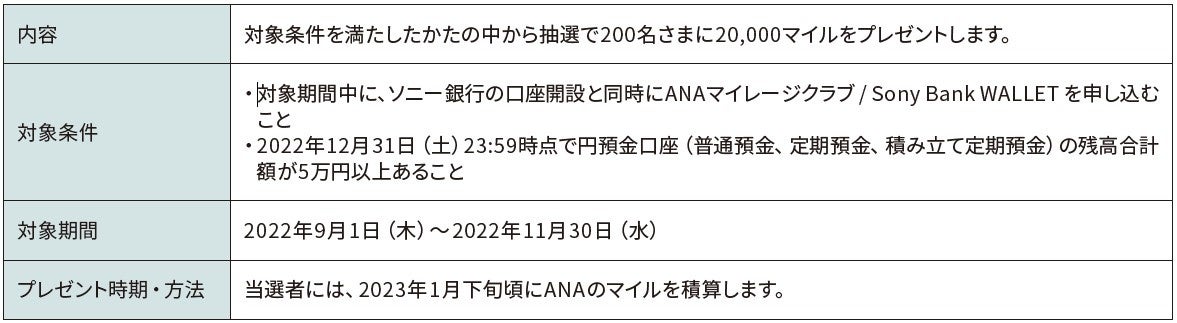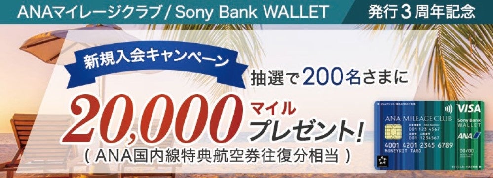 「ANAマイレージクラブ / Sony Bank WALLET 発行3周年記念 新規入会キャンペーン」実施のお知らせ ~抽選で200名さまに20,000マイルプレゼント~
