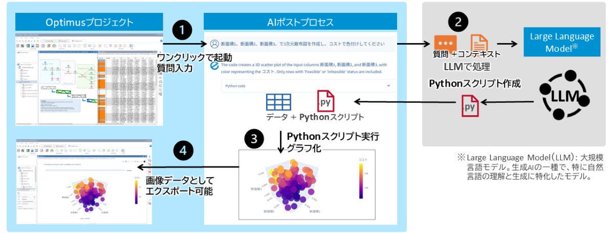 AIポストプロセスのLLMで処理される情報にはユーザー固有の機密データは含まれません。Optimusの処理方法の構造や入出力変数の数など一般的な情報に限られるため、データの機密性を保ったまま利用できます。