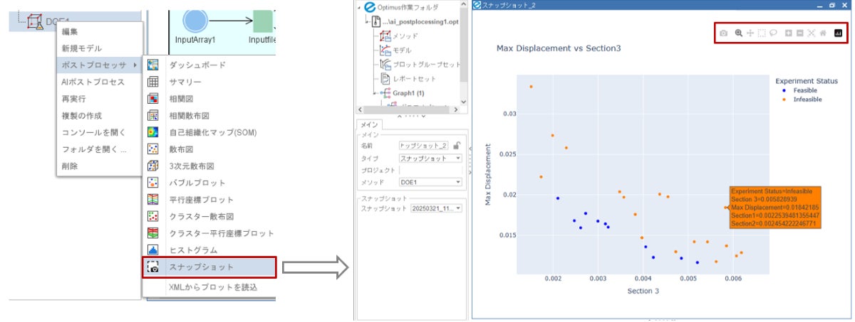 AIポストプロセスでエクスポートしたファイル(*.PNG、*.html)をOptimusのGUI内で表示できるポストプロット「スナップショット」が追加されました。HTMLファイルの場合、グラフ等のファイルはWebブラウザと同様に、拡大/縮小などの操作が可能です。AIポストプロセスの結果をチーム内で共有しやすくなるほか、任意のファイル(*.PNG、*.html)を表示することも可能なため、レポート作成などに必要な情報を盛り込みやすくなります。