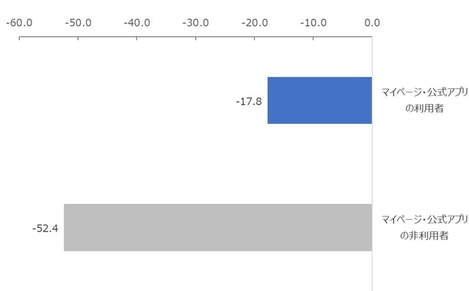 1年以内の契約者向けマイページや公式アプリの利用有無について調査したところ、全体の21.1%がマイページや公式アプリを利用している結果となりました。また、マイページや公式アプリの利用有無別にNPSを分析したところ、マイページや公式アプリの利用者のNPSは-17.8となり、非利用者と比較して高くなりました。