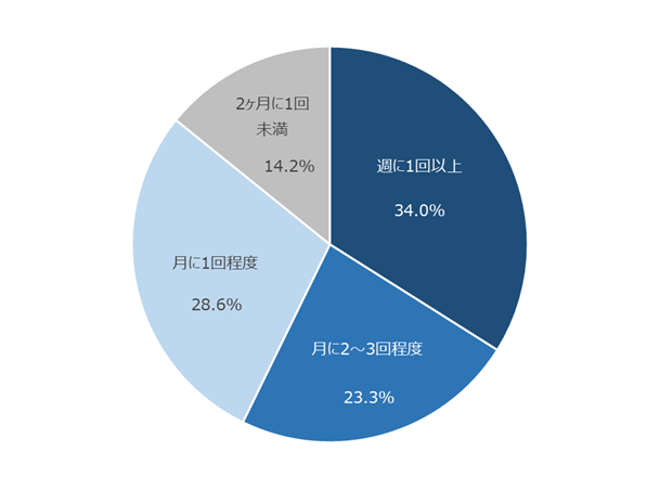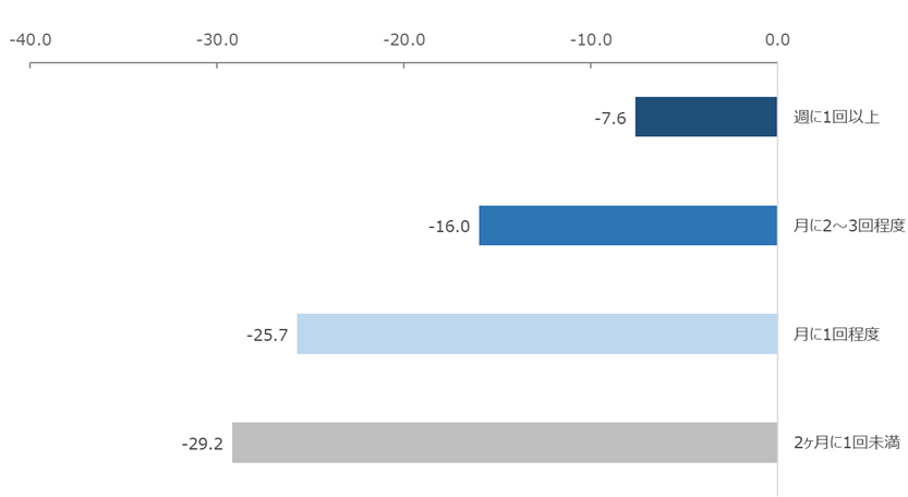 さらに、マイページや公式アプリの利用頻度を調査したところ、最も多いのは「週に1回以上」(34.0%)、次いで多いのは「月に1回程度」(28.6%)となりました。また、マイページや公式アプリの利用頻度別にNPSを分析したところ、「週に1回以上」利用している人のNPSは-7.6と高く、利用頻度が高くなるほどNPSも高くなる傾向がみられました。マイページや公式アプリのアクティブ率を高めることの重要性が示唆される結果となりました。