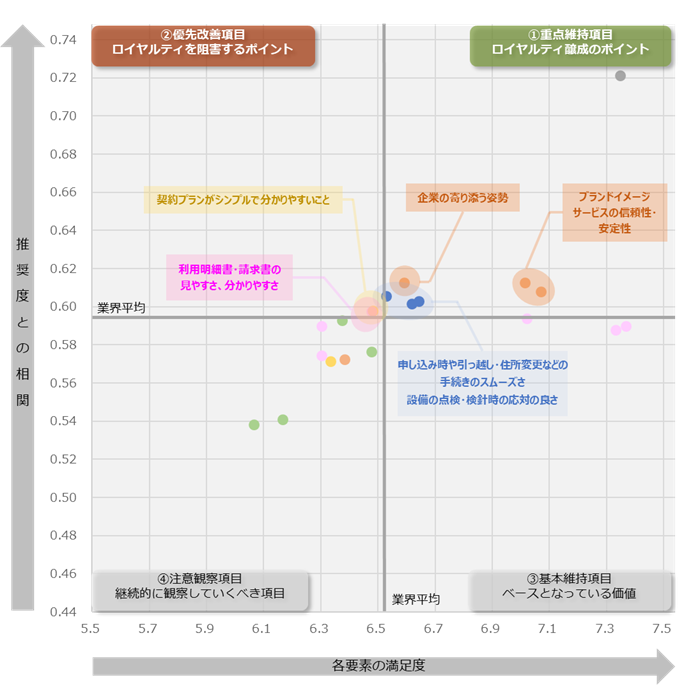 20の項目別に業界全体のロイヤルティの要因を分析したところ、「企業の信頼性・ブランドイメージ」や「サービスの信頼性・安定性」、「お客さまに寄り添う姿勢・大切にする姿勢」がロイヤルティを醸成する要因となりました。また、「申し込み時の手続きのスムーズさ」や「引越し手続きや住所変更、プラン変更などの手続きのスムーズさ」に加え、「設備の点検・検針時の応対の良さ」といった手続きや応対品質に関する項目がNPSを高める要因となりました。