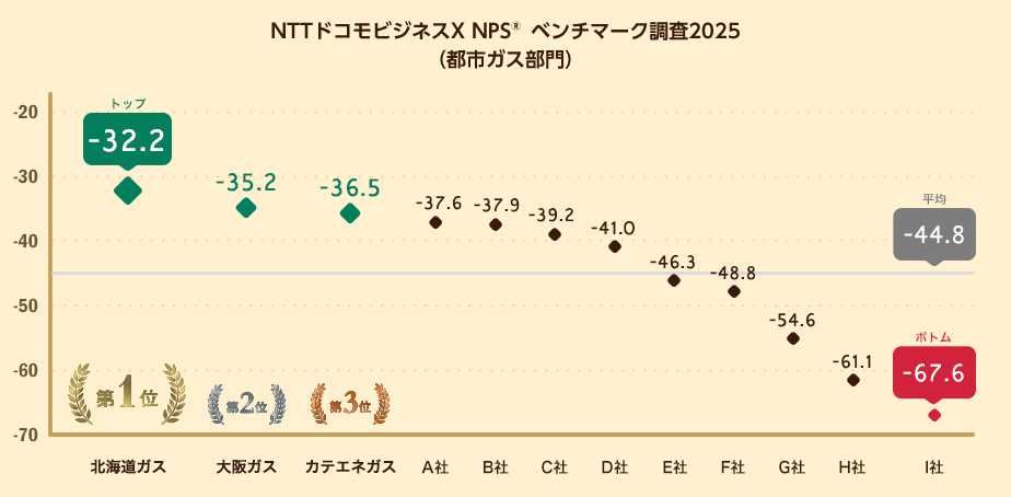 対象の都市ガス12社のうち、NPSのトップは北海道ガス(-32.2)、2位は大阪ガス(-35.2)、3位はカテエネガス(中部電力ミライズ)(-36.5)となりました。12社のNPS平均は-44.8、トップ企業とボトム企業との差は35.4ポイントとなりました。