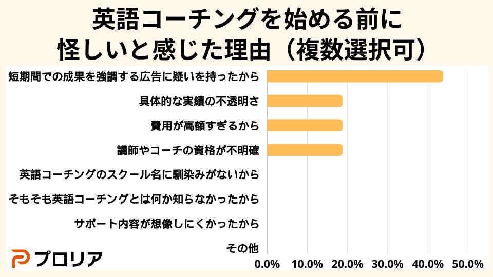 英語コーチングを始める前に「怪しい」と感じた方は20%で、その理由として「短期間での成果を強調する広告に疑念を持った」(43.8%)が最も多かった。