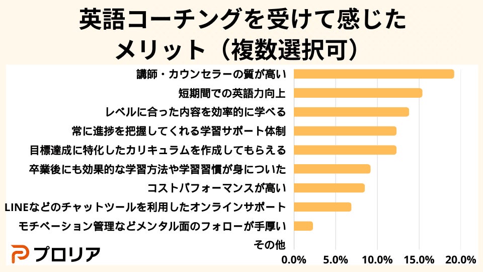 全体に聞いた最も多かったメリットは「講師・カウンセラーの質が高い」こと。他にも様々なメリットがあることが調査結果から見受けられました。