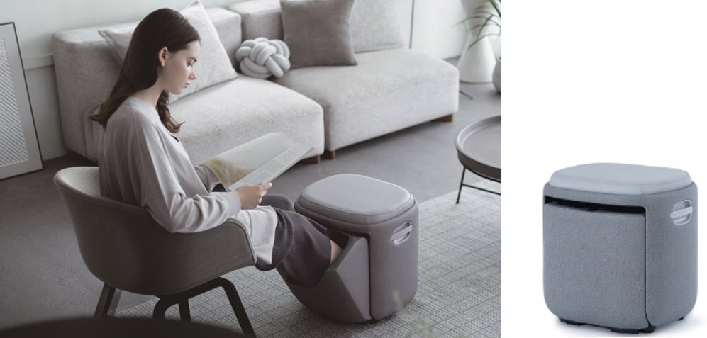 スツール型のフットマッサージャー。ふくらはぎ・足首・足の甲をエアバックと足裏全体をローラータイプのもみ玉が疲れた脚をしっかり揉みほぐします。