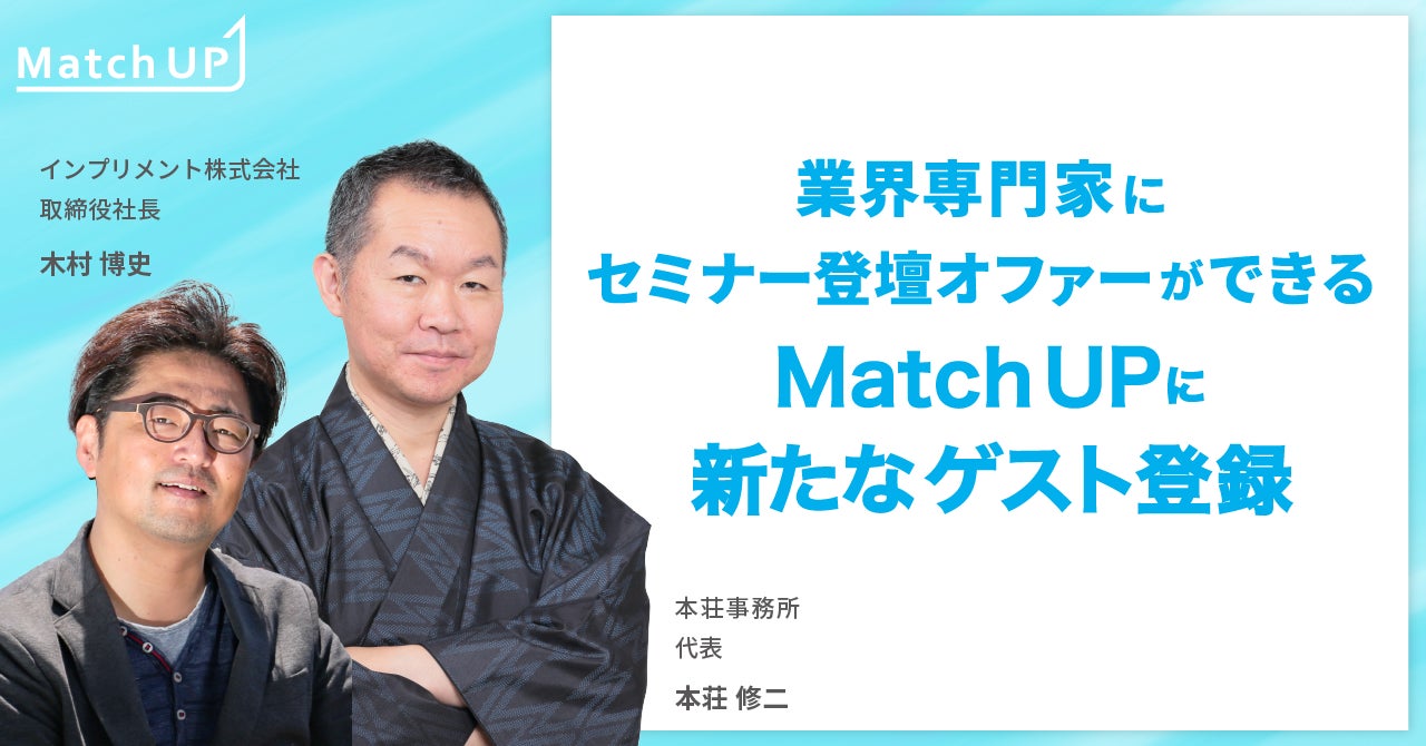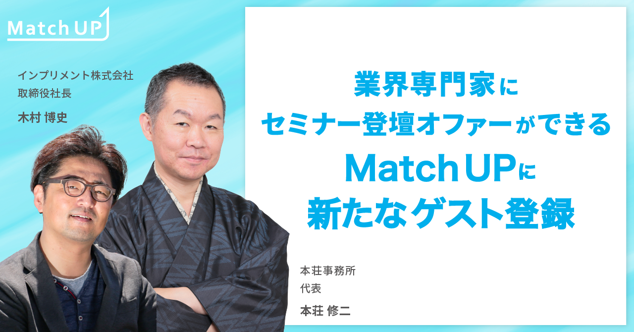 業界専門家にセミナー登壇オファーができる「Match UP」本荘事務所 本荘 修二氏、インプリメント株式会社 木村 博史氏が新たにゲスト登録