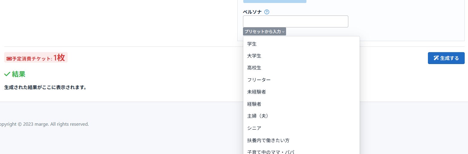 ターゲットとする求職者に合わせた訴求内容で求人作成やリライトを行う機能です。適切なペルソナ設定を行うことで応募率の改善が期待できます。ペルソナは学生向け、主婦向けなど多数ご用意しております。その為、複雑な設定は不要でAI任せで対象に合わせた文章が生成できます。