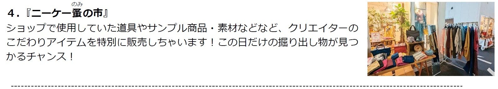 ■この度、今年のイベントラインナップが決まり、当イベントオリジナル企画に加え、各ショップ別のイベントも実施いたします。イベント企画の一つである、『選べる革バッグづくり』は、参加事前申込の受付を開始いたしました。