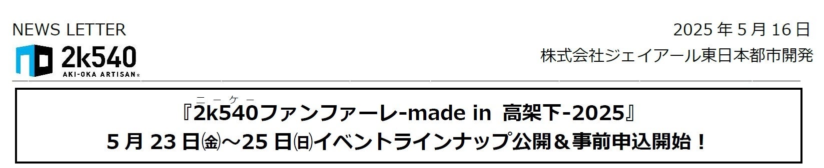 ■JR秋葉原~御徒町駅間高架下にある“日本のものづくり”がコンセプトの商業施設『2k540 AKI-OKA ARTISAN(ニーケーゴーヨンマル アキオカ アルチザン)』(以降、「2k540」)では、2025年5月23日㈮から25日㈰までの3日間、『2k540(ニーケー)ファンファーレ -made in 高架下-2025』と題し、ものづくりを体験し、楽しんでいただけるイベントを開催いたします。
