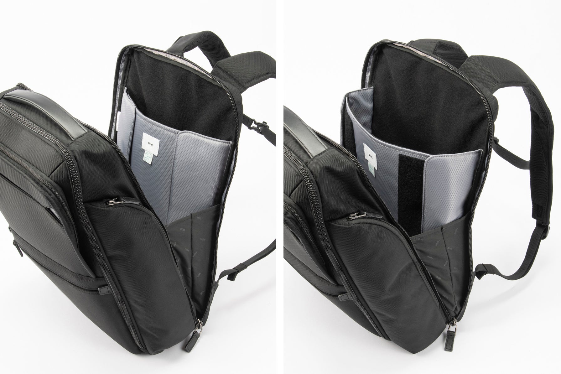 PC収納部 … マチ幅を調整可能にしたことで、PCの厚さに関わらず、形状に合わせて収納できるようになりました。