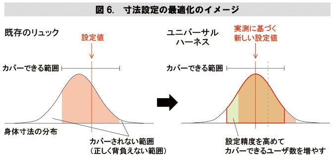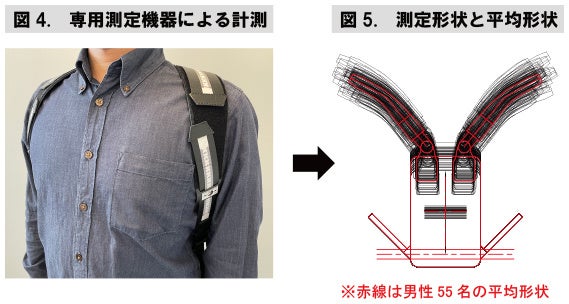 実測に基づく平均的なリュックハーネス形状。リュック専用の人体測定器を開発し、20~60歳までの男性被験者55名を計測(図4)。平均的なハーネス形状、取付位置、取り付け角度を導くことで(図5)、より多くのユーザーにフィットする「ユニバーサルハーネス」として最適化しました(図6)。