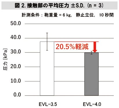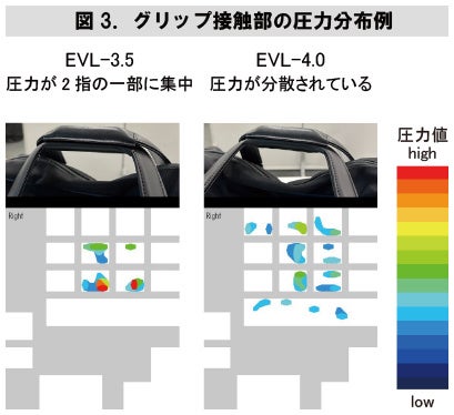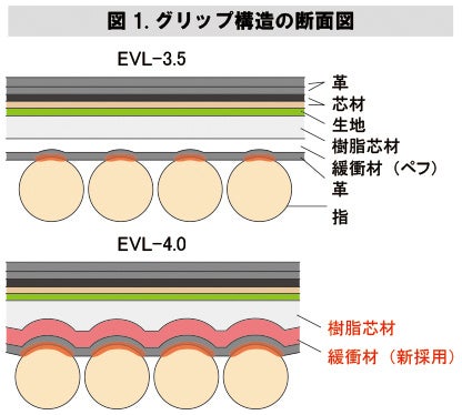 従来のグリップは指との接触面が少なく、狭い範囲に荷重が集中していました。EVL-4.0では、指の形状に合わせて凹ませた樹脂芯材と、衝撃吸収と柔軟性に優れる緩衝材を組み合わせることで、指との接触面積を増やし荷重を分散します(図3)。