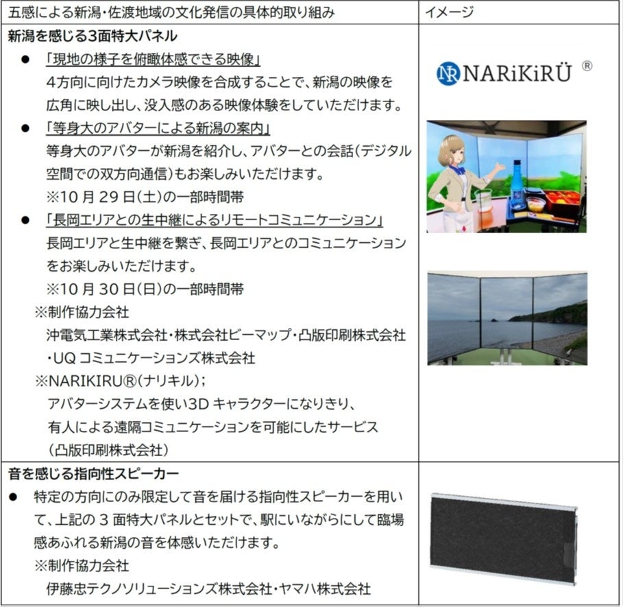 2022年10月14日(金)から10月16日(日)、ならびに10月25日(火)から10月30日(日)までの間、3面特大パネル、指向性スピーカー、ディフューザー、光による床面案内によって、風景・音・香りなどを感じながら、新潟・佐渡地域の文化をお楽しみいただけます。この取り組みは、JR東日本が主催するモビリティ変革コンソーシアムのFuture Lifestyle WGの実証実験の一環です。