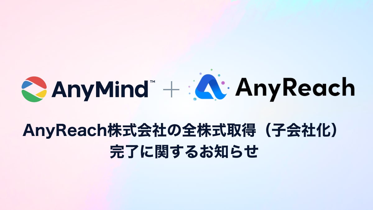 AnyMind Group株式会社(読み:エニーマインドグループ、代表取締役CEO:十河 宏輔、以下「当社」)は、当社の完全子会社であるAnyMind Japan株式会社を通じて、eギフトサービス事業を展開するAnyReach株式会社(読み:エニーリーチ、代表取締役:中島 功之祐)以下「AnyReach社」)の全株式の譲渡手続きを完了し、同社を完全子会社化したことをお知らせします。AnyReach社は日本において、その社名を維持したまま事業運営を継続します。