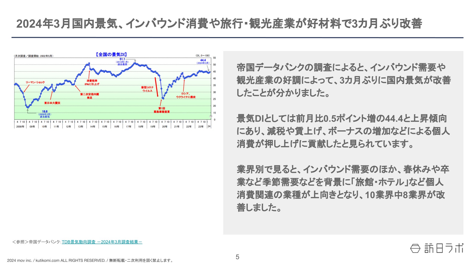 2024年3月国内景気、インバウンド消費や旅行・観光産業が好材料で3カ月ぶり改善