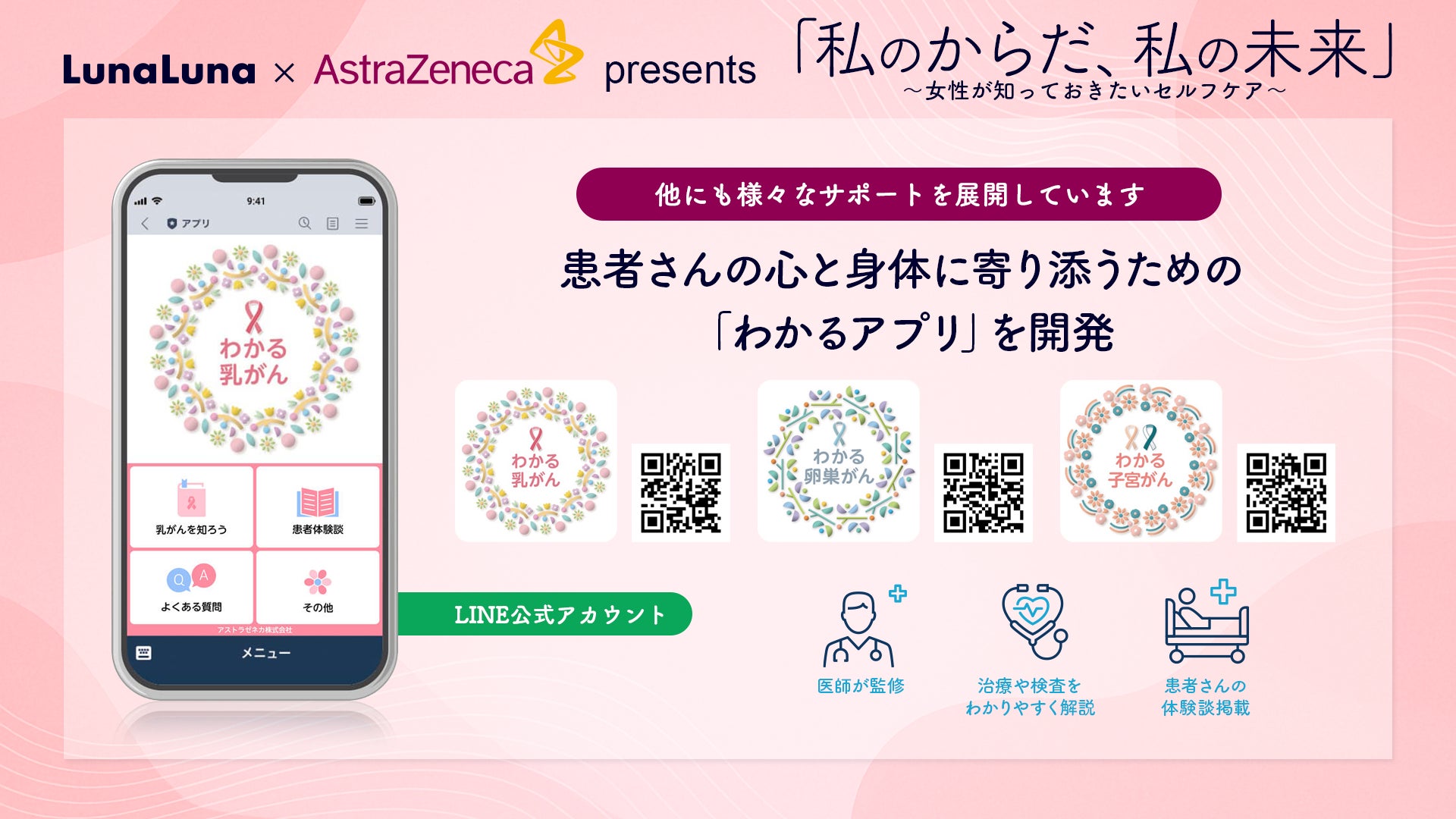 最後に、アストラゼネカが運営する乳がん・婦人科がんに関するLINE公式アカウントを紹介しました。医学専門家による監修のもと、がんについての知識や患者さんの体験談をまとめており、診断の有無に関わらず、女性なら知っておきたい内容を手軽に読むことができます。無料で使い始められるので、ぜひ友だち登録してお試しください。