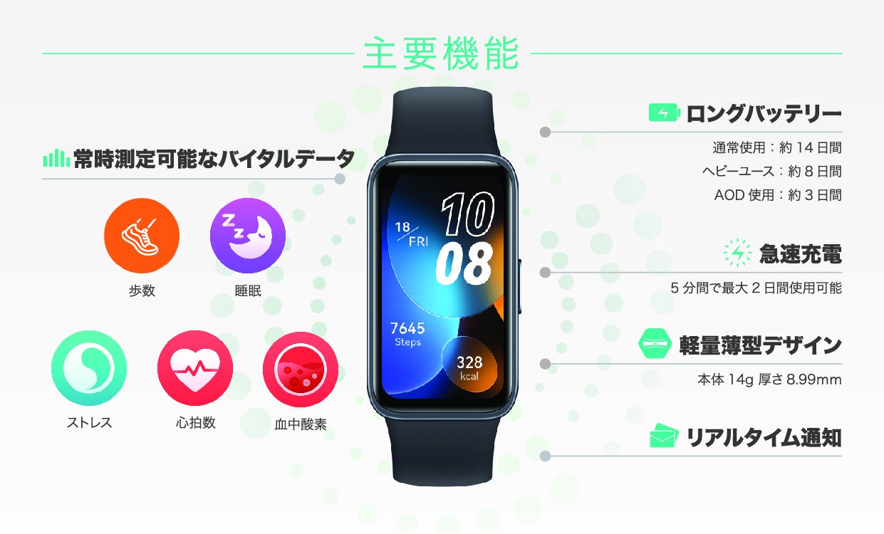 歩数、睡眠、ストレス、心拍数、血中酸素を含むバイタルデータを常時測定※できます。本体重量約14gと軽量薄型デザインで日常使用の負担になりません。