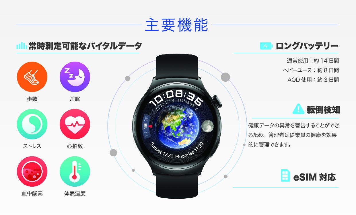 eSIMに対応しているため、ウォッチのみでの通信が可能です。歩数、睡眠、ストレス、心拍数、血中酸素、体表温度を含むバイタルデータを常時測定※できるほか、転倒検知機能を搭載しています。