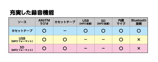 USBメモリーやSDカードにMP3フォーマットで録音ができます。もちろんカセットテープへの録音も可能なので、オリジナルカセットテープの作成も楽しめます。