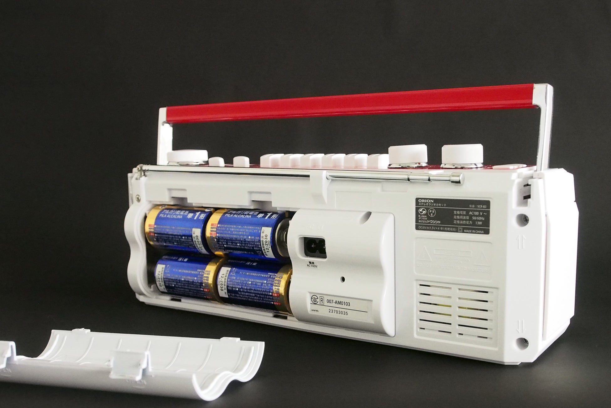 AC電源のほか、乾電池でも動作します。単1形乾電池4本で電源の無い場所でも使えます。