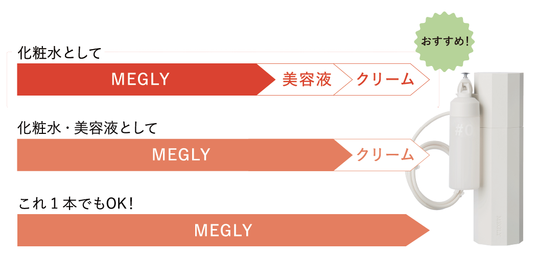 「MEGLY」は、わずか8秒でめぐり*³、気持ちアガルほど肌を引き締める、高濃度炭酸*²入り化粧水ミストです。面倒くさいと感じやすいスキンケアが、片手で吹きかけるだけのデバイスにより超ラクを実現。