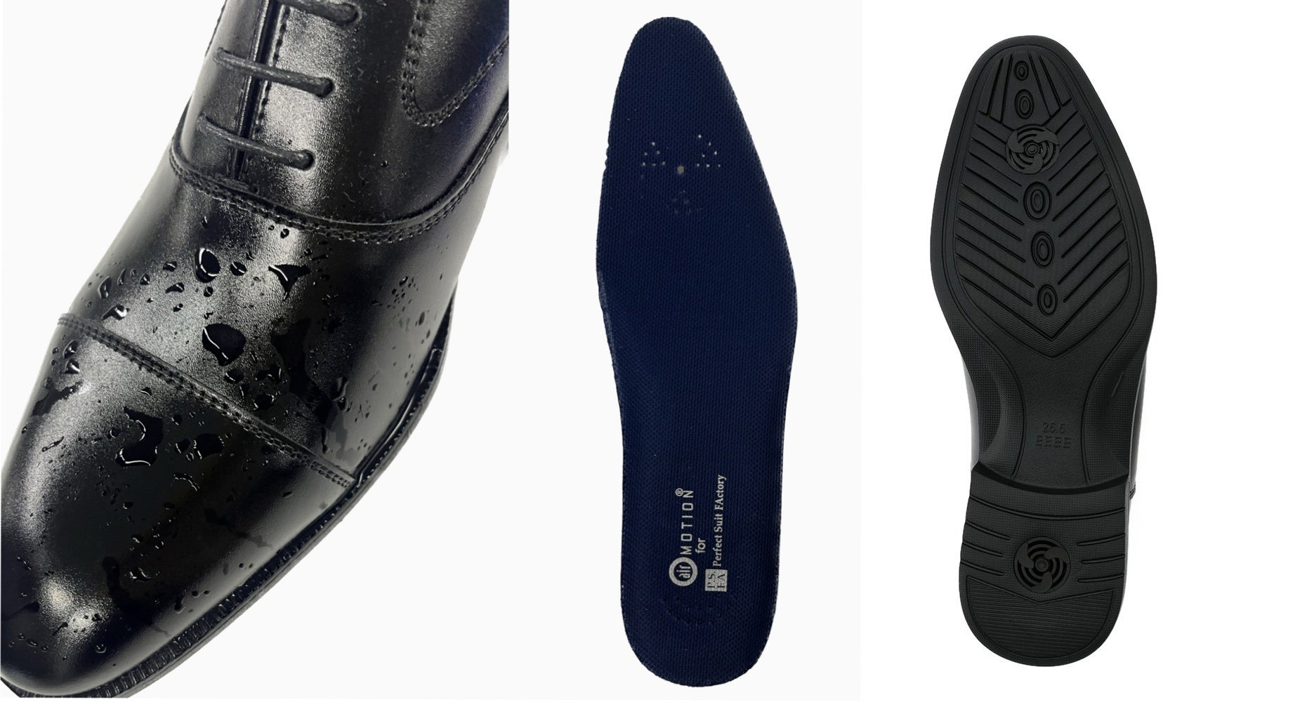 靴底に通気パーツを設置し、水の侵入を防ぎながら靴内の湿気を排出し空気の循環を促します。歩行に合わせて靴底から靴中に空気を循環させます。歩行時に靴内の空気を循環させることで、靴内がムレにくく、快適な履き心地を実現したビジネスシューズです。
