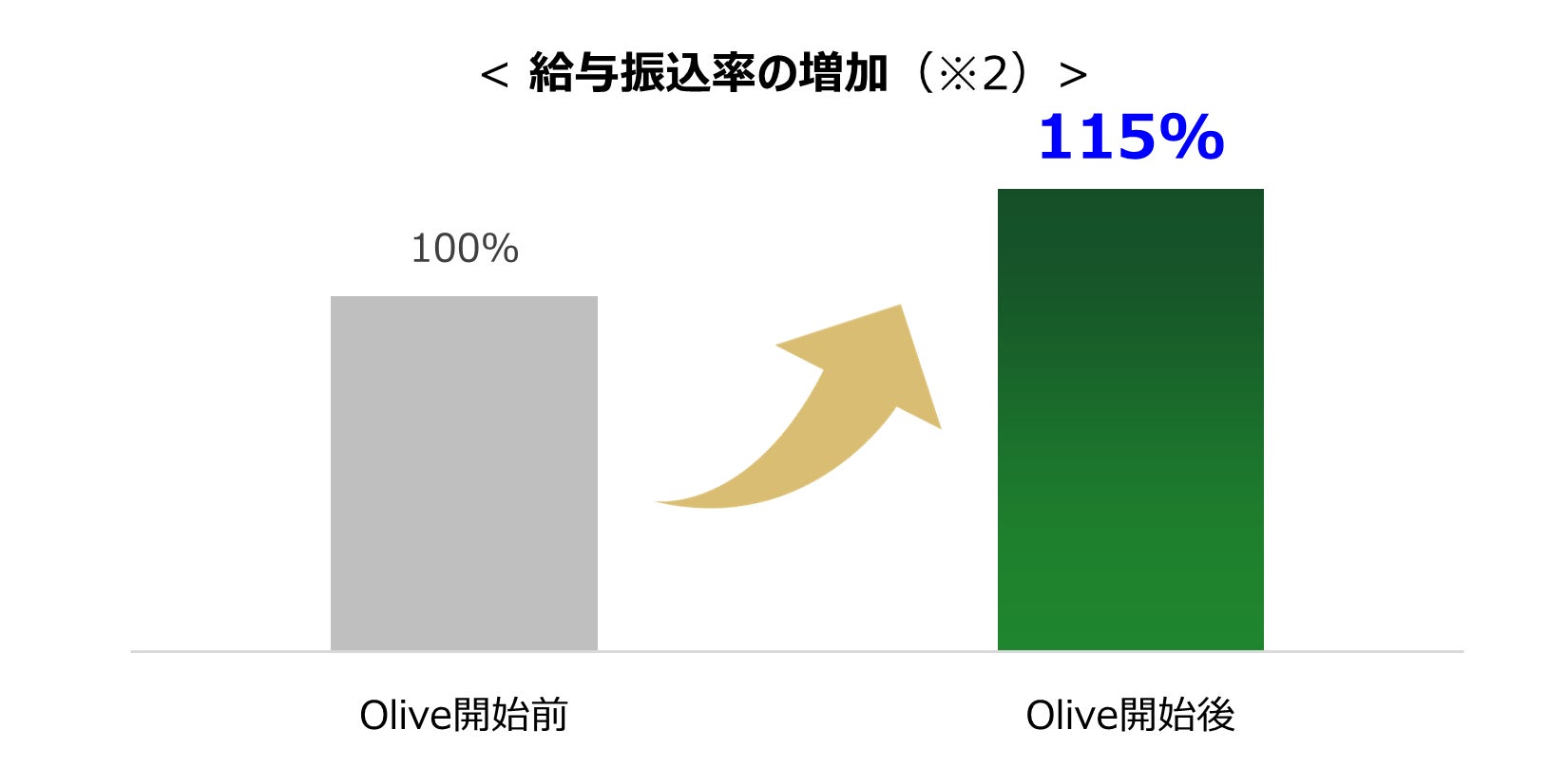 当行の既存口座からOliveへ切り替えたお客さまのうち、Oliveを給与振込先口座としている方の割合、給与振込率(※1)は、115%に増加しており、Oliveをきっかけに当行をメインバンク として日常的にご利用いただいている方が増えていることが読み取れます。