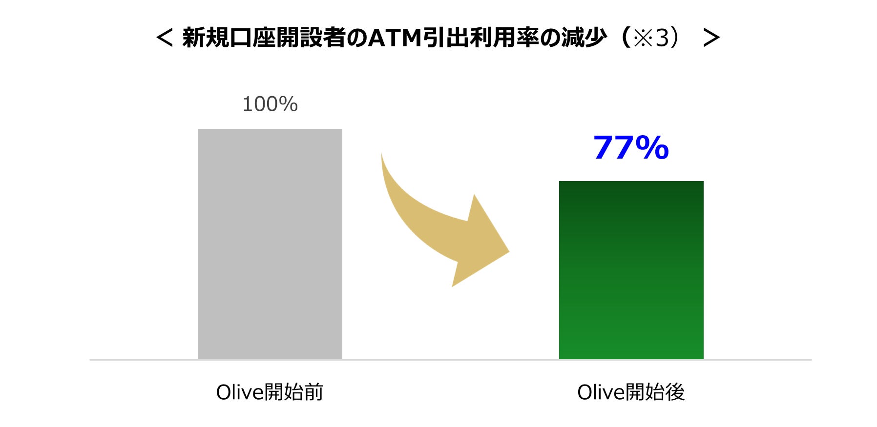 Oliveの開始以降、当行で新規口座開設されたお客さまのATM引出利用率が減少しております。ATM引出利用率について、Olive開始前後で比較すると約23%減少しており、ATMを介して現金を引き出し、使用する機会が減っていることが伺えます。