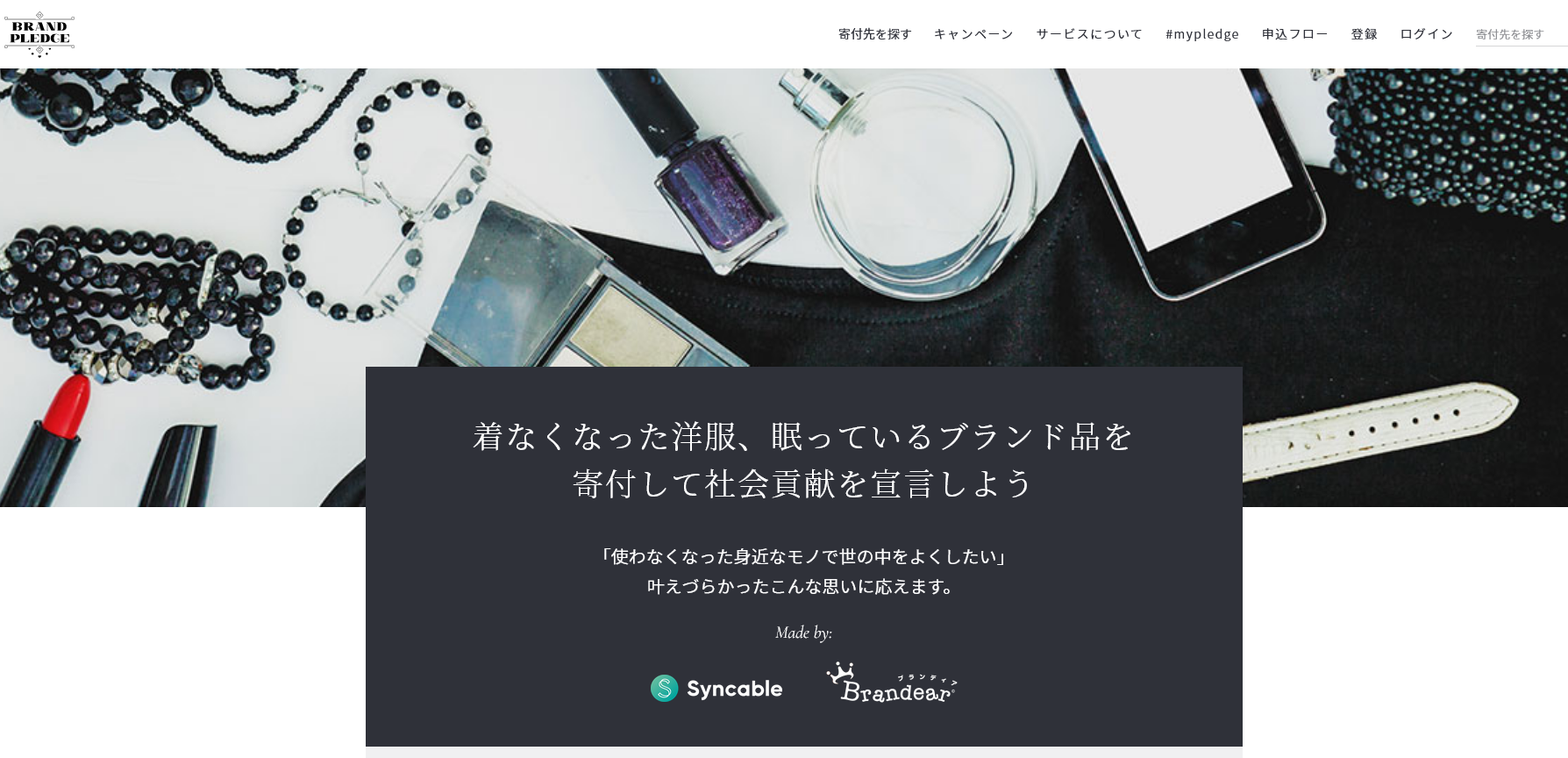 ブランディアと非営利団体向けクラウドファンディングSyncableが運営すすブランド品の買取金額から任意の金額をサイトに登録している様々な活動・団体に寄付できるサービスです。寄付先によっては寄付金控除を受けることも可能です。寄付できる団体・買取対象ブランドはこちら( https://brand-pledge.jp/about-service )よりご確認ください。