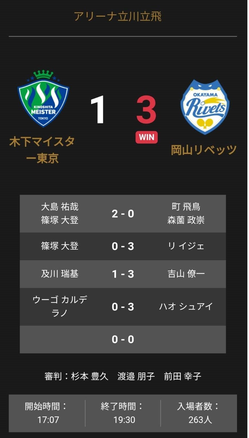 木下マイスター東京と岡山リベッツの試合は3-1で岡山リベッツが勝利しました。