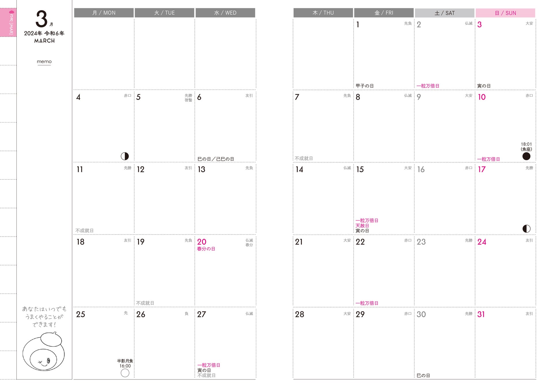 思考は現実になりやすく、強い力をもっています。本手帳を毎日眺めたり、活用すればするほど、開運的思考に導かれ、その思いは現実のものとなるでしょう。皆さまの2024年度が幸福に満ちたものになるよう願っています。