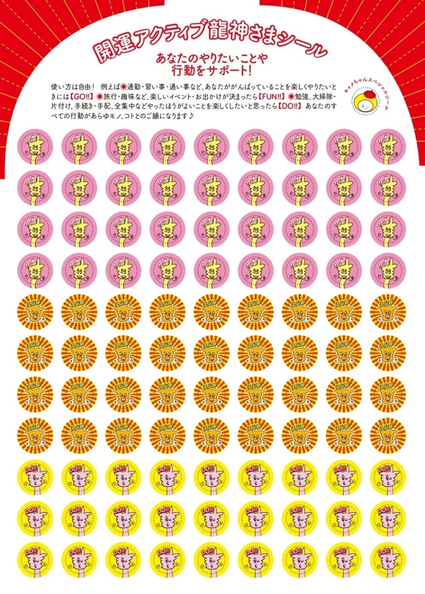 行きたいことには「GO」シール、趣味や楽しいことには「FUN」シール、やりたいことには「DO」シール、オリジナルの龍神キャラが、あなたの開運行動がより楽しくなるよう応援します。