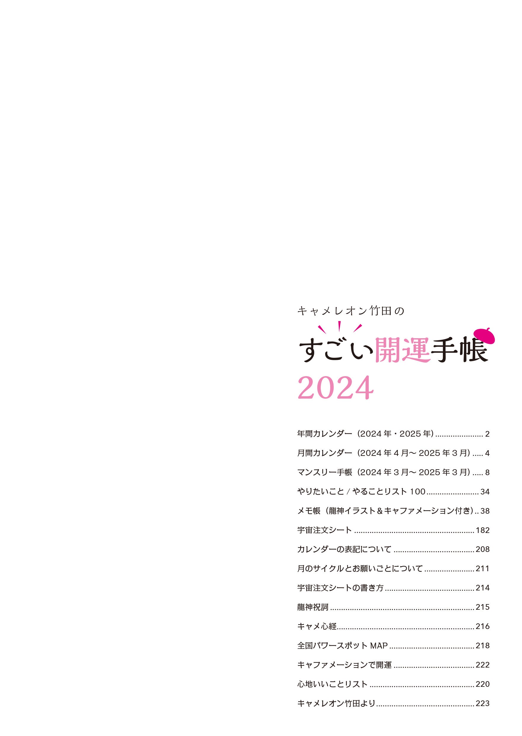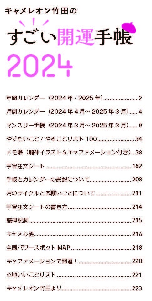 「一粒万倍日」「やりたいこと/心地いいことリスト」「宇宙注文シート」etc…開運のためのアクションがもりだくさん!画家であり人気占い師のキャメレオン竹田氏の開運手帳2024年度版