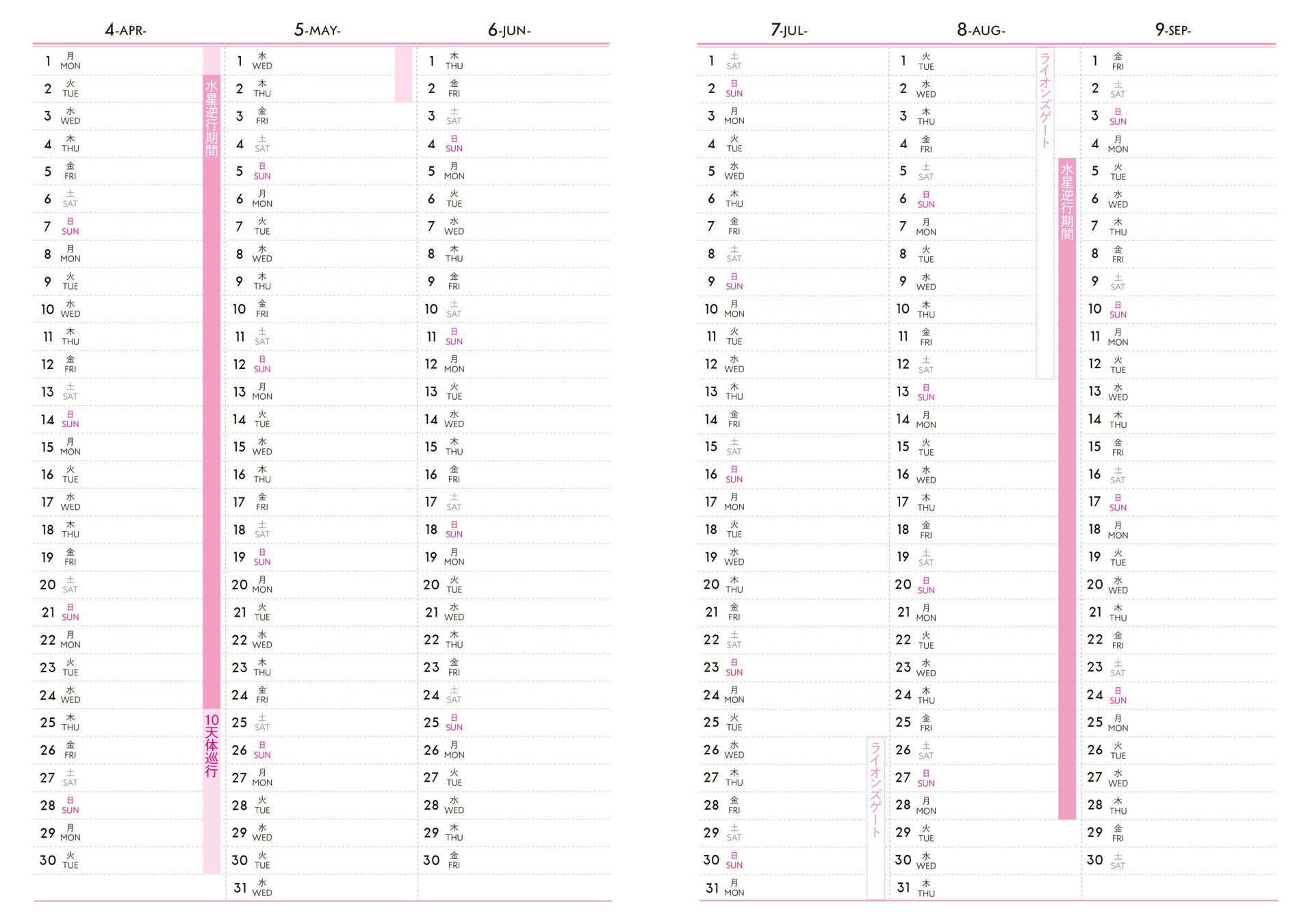 ライオンズゲートや天体・順行逆行移行期間は、②月間カレンダーの期間をご覧ください。