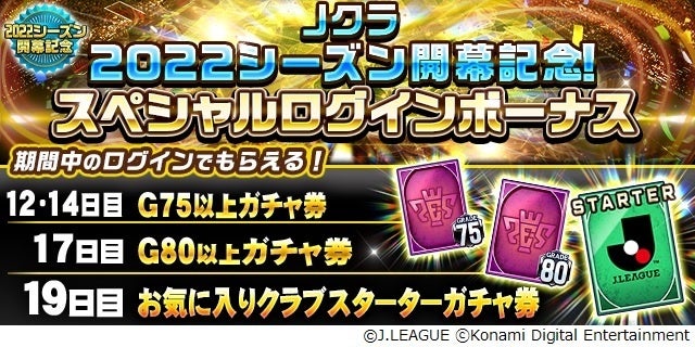 既存の方には「Jクラ2022シーズン開幕記念!スペシャルログインボーナス」で「お気に入りクラブスターターガチャ券」が獲得できます。