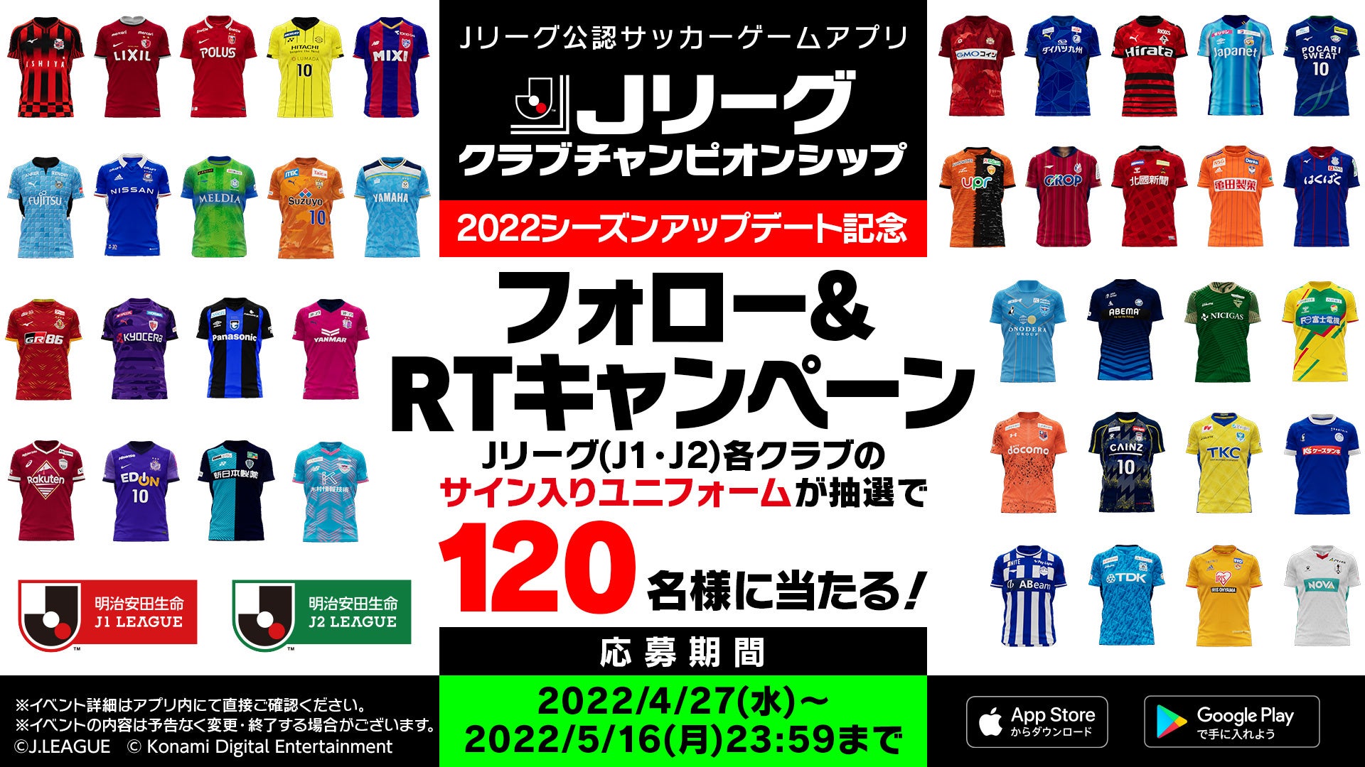 『Jクラ』では2022シーズンアップデートを記念してJ1、J2各クラブのサイン入りユニフォームを合計120名様にプレゼントします。(各クラブ3名様×J1、J2全40クラブ)