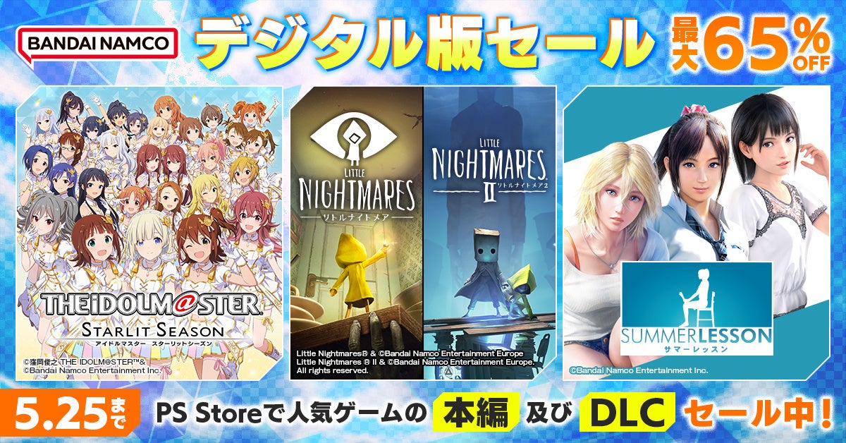 セール期間中、「アイドルマスター スターリットシーズン」が30%OFFの6,314円(税込)、「リトルナイトメア1+2 バンドルエディション」が40%OFFの3,564円(税込)、「サマーレッスン:宮本ひかり デラックス版」が65%OFFの2,844円(税込)になるなど、バンダイナムコエンターテインメントのダウンロード版ゲームがお得な価格でお買い求めいただけます。このチャンスをお見逃しなく!