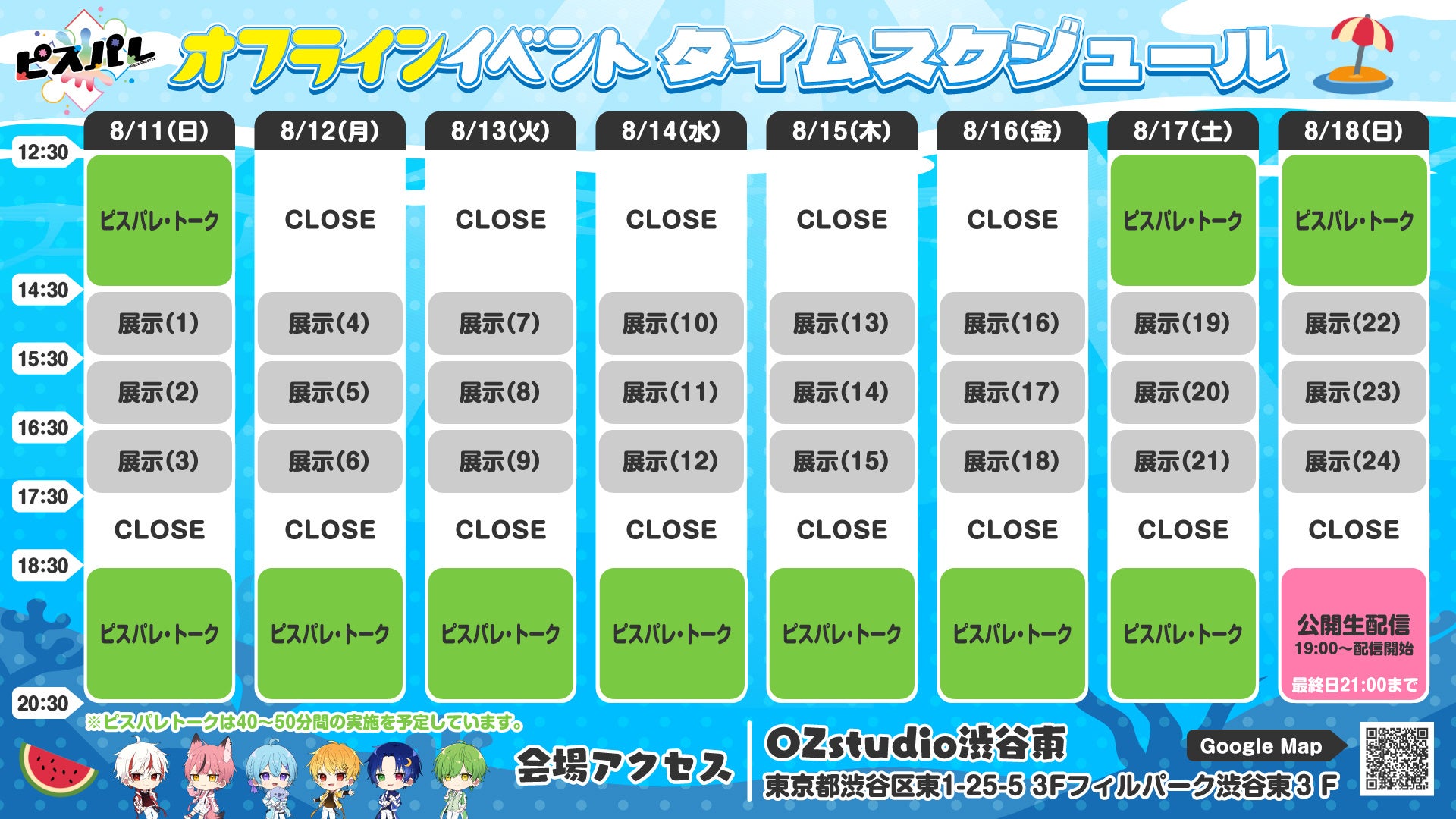 ピスパレ初のオフラインイベントを8月11日(日)〜8月18日(日)の8日間、東京・渋谷「OZstudio 」にて開催します。フォトブースなどの展示コーナー、来場した「ぴすふぁみ」とメンバーがリアルタイムで画面越しに会話する「ピスパレ・トーク」の開催に加えて、18日には公開生配信も実施します。入場特典もご用意しておりますので、最高な夏の思い出作りにぜひイベントへお越しください。「ピスパレ・トーク」と公開生配信は抽選制となります。