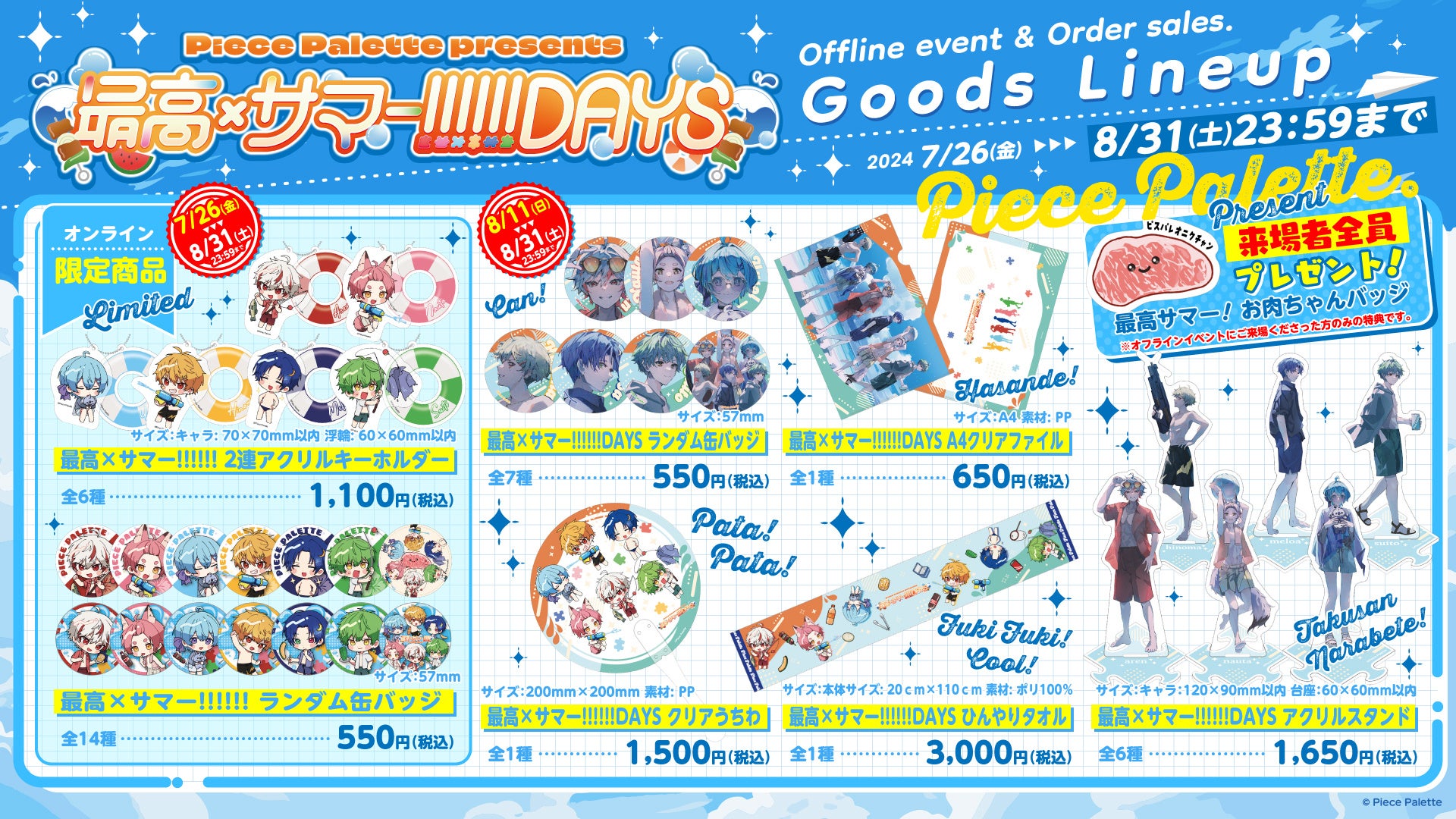 ピスパレの最高な夏にふさわしいオリジナルグッズ第1弾は「ランダム缶バッジ」や「アクリルスタンド」など、ピスパレ公式ショップ限定で本日7月26日から8月31日まで販売します。「ひんやりタオル」や「うちわ」などがラインナップに並ぶ第2弾はオフラインイベント会場とピスパレ公式ストアで8月11日から8月31日まで同時販売予定です。