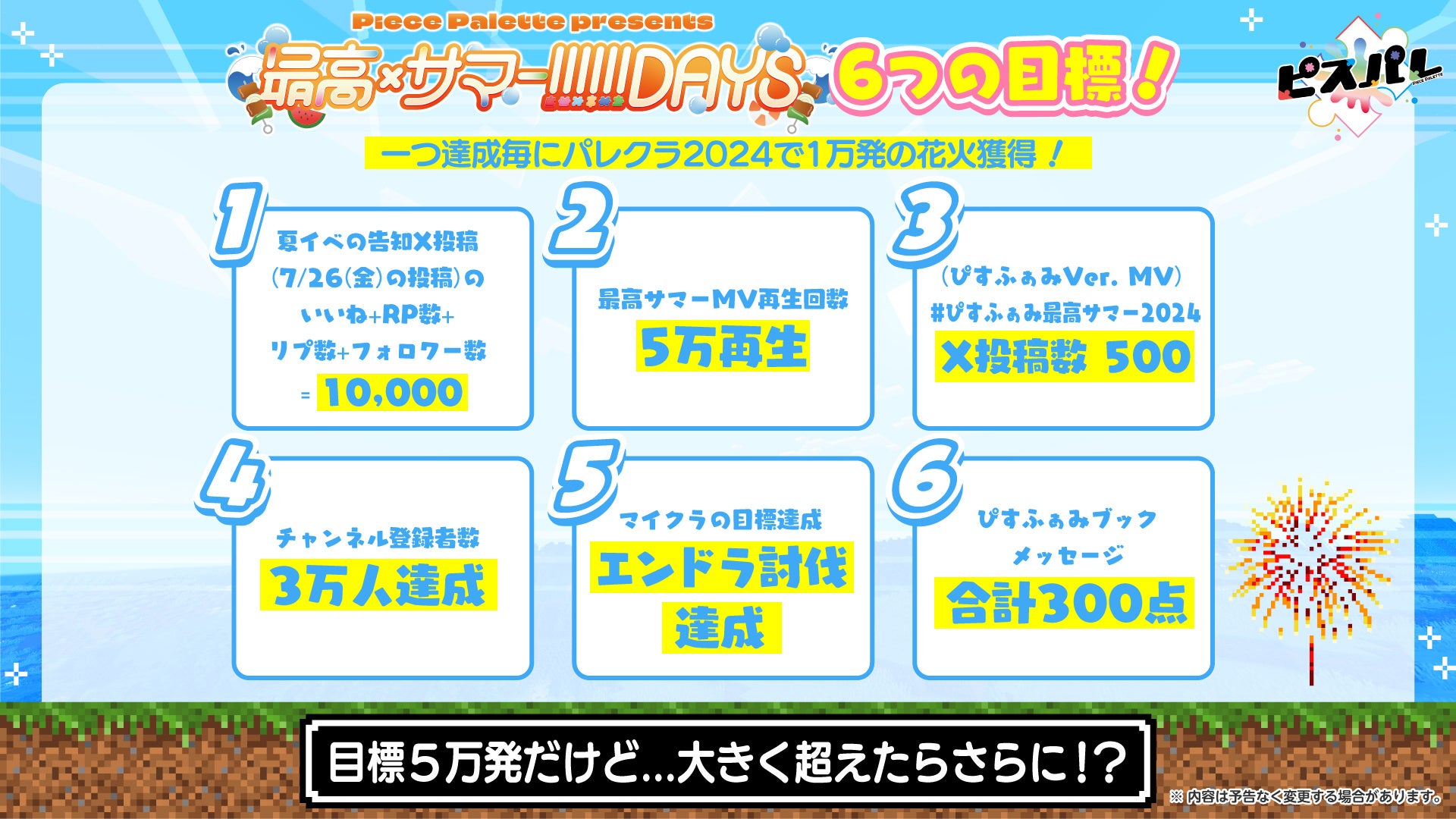 ピスパレが人気ゲーム「マインクラフト」内で「ピスパレ花火大会」を8月31日(土)に開催します。同イベントではピスパレ運営が設定した目標を1つ達成するごとに、マイクラ内で1万発の花火を打ち上げます。日本国内における実際の花火大会の最多打ち上げ数は約4万発。運営が設定した目標をクリアして、ピスパレメンバーたちと最大6万発の花火を打ち上げて、夏の思い出を振り返りましょう。