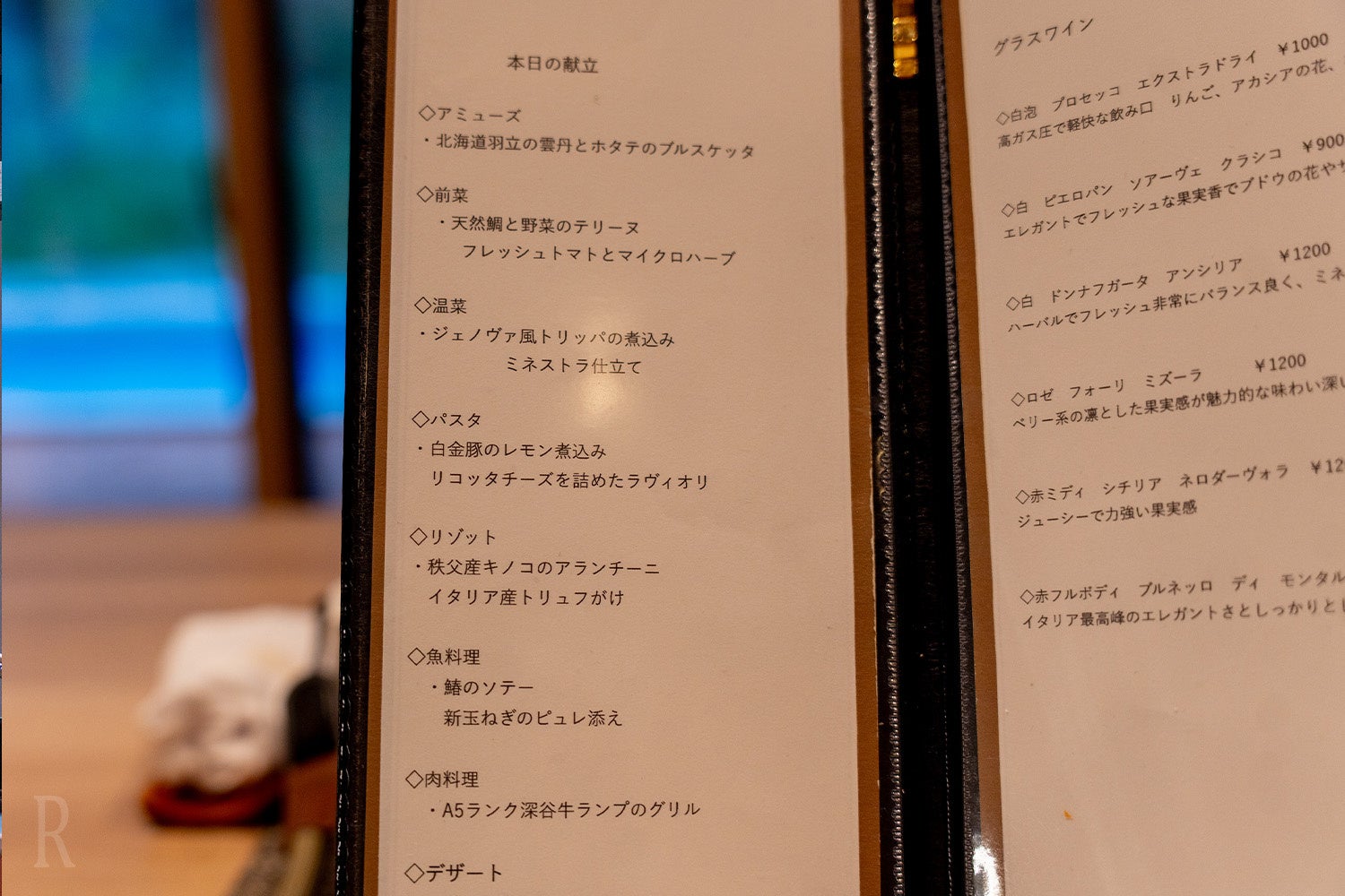 出張シェフが仕上げるのは、和の技法をベースに、イタリアンの自由な発想を掛け合わせた“和×伊”の創作フルコース。旬の秩父食材を最大限に活かし、繊細な温前菜から香ばしく火入れされた炭火焼き、トリッパやリゾット、そして季節のドルチェに至るまで。