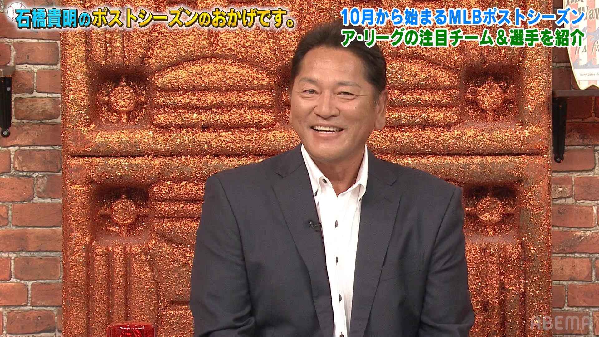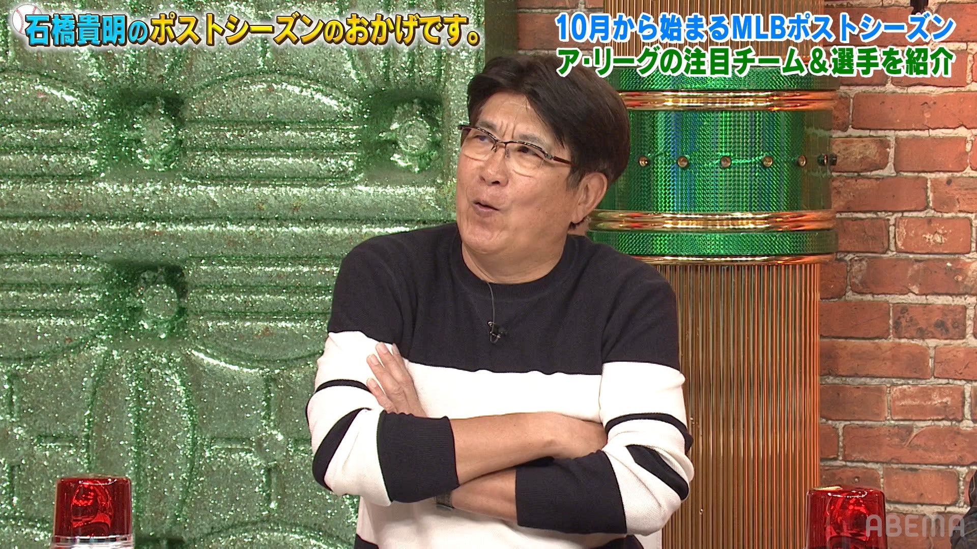本番組は、日本時間2024年10 月2日(水)から幕をあける『MLB2024 ポストシーズン』の厳選11 試合を「ABEMA」が無料生中継するのに先立ち、大の野球好きとして知られる石橋貴明さんが野球通の芸能人らと試合展望などについて語り尽くしました。