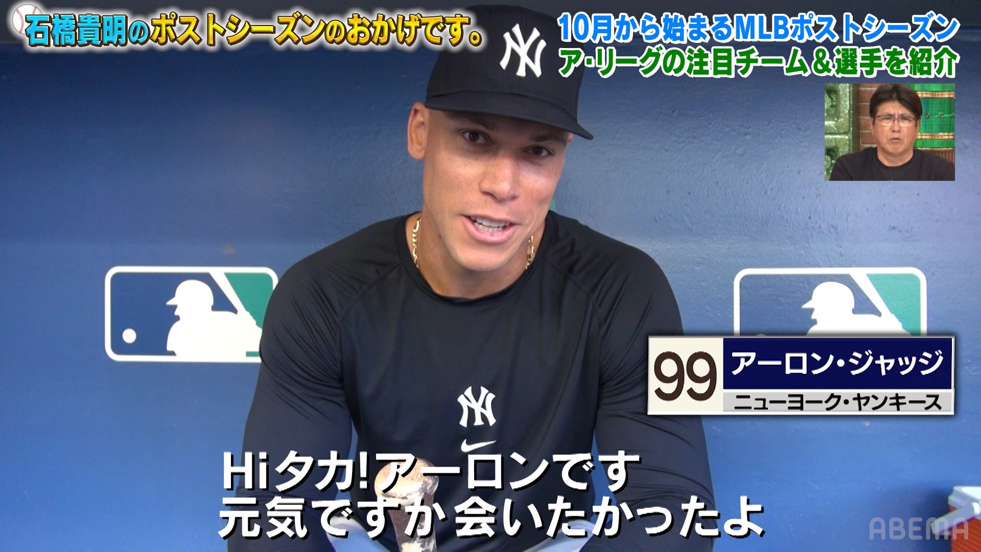 また、番組では、MLB選手へ独占インタビューを実施すると、彼らから石橋さんへビデオメッセージが到着。ヤンキースのアンソニー・リゾ選手は「ポストシーズンでは、たくさんの“MARBLES”が必要なんだ」と、石橋さんが出演した映画『メジャーリーグ2』で演じた“タカ・タナカ”の名台詞を引用してラブコール。