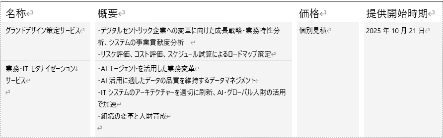 具体的には、「グランドデザイン策定サービス」において、変革に必要な投資の優先順位などを踏まえたグランドデザインと、システム刷新に必要な技術選定やリスク評価を含む実効性の高いロードマップを策定します。また、「業務・ITモダナイゼーションサービス」では、AIを活用した業務自動化による業務変革の推進、重要データの特定やデータ品質の維持、そして最新アーキテクチャーへの刷新を行います。さらに、システム刷新の全工程へのAI活用に加え、豊富なグローバル人財を活用し開発の迅速化を図るほか、グランドデザインに基づく実行体制の構築やデジタル人財の育成も行います。これらにより、デジタルセントリック企業に向けたモダナイゼーションを推進することが可能になります。