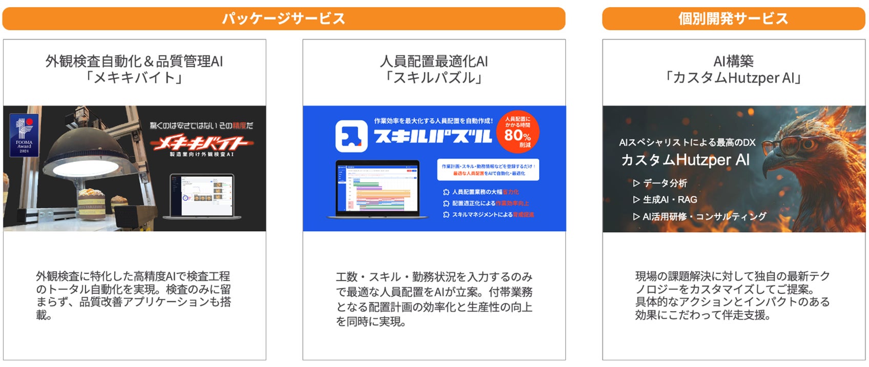 フツパーは、製造現場に特化した“はやい・やすい・超巧い ”AIソリューションを提供するスタートアップです。外観検査AIサービス「メキキバイト」やデータ分析AI開発サービス「カスタムHutzper AI」、人員配置最適化AI「スキルパズル」などを通じて、製造現場の人材不足解消や業務効率改善に取り組んでいます。