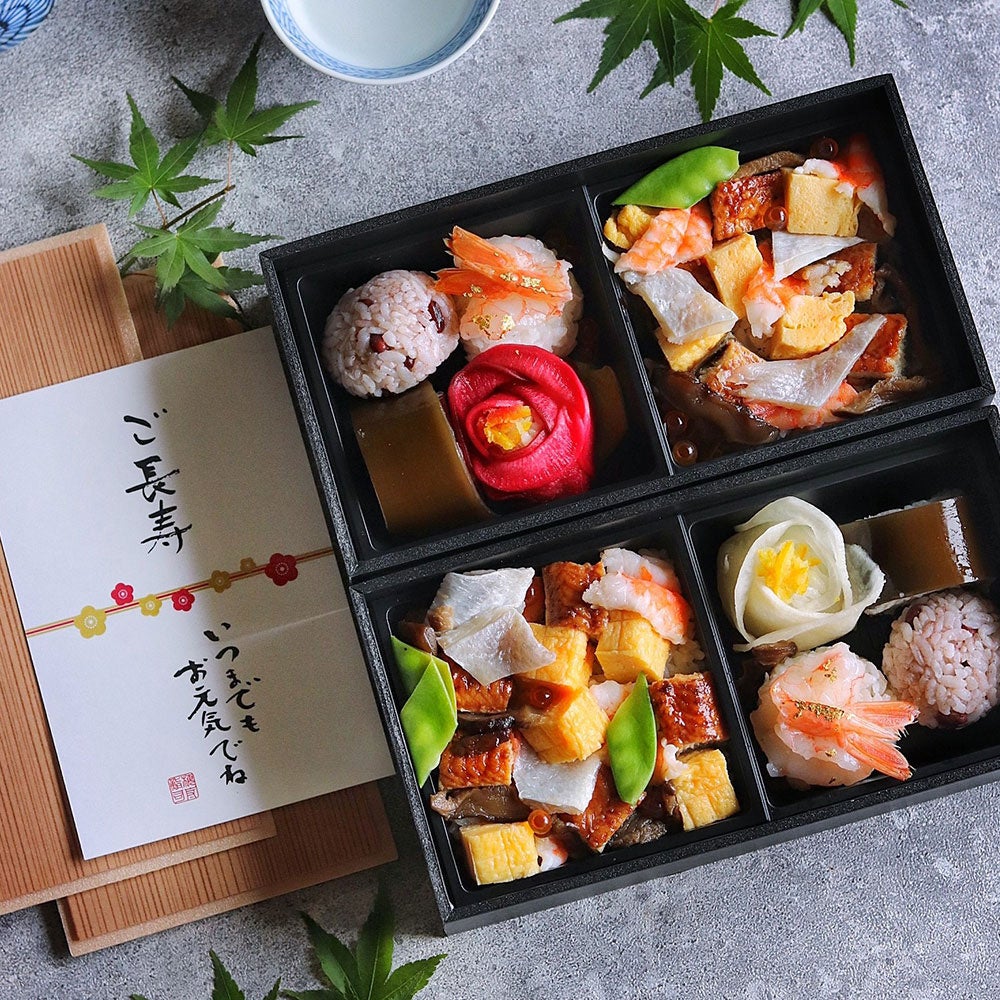 日本ギフト大賞2018ふるさとギフト最高賞を受賞した商品の中から、彩り豊かな紅華手鞠と手鞠赤海老をセレクトし、長寿のお祝いを飾る2つのお重に仕上げました。「いつまでもお元気でね」のメッセージカードを添えてお届けいたします。