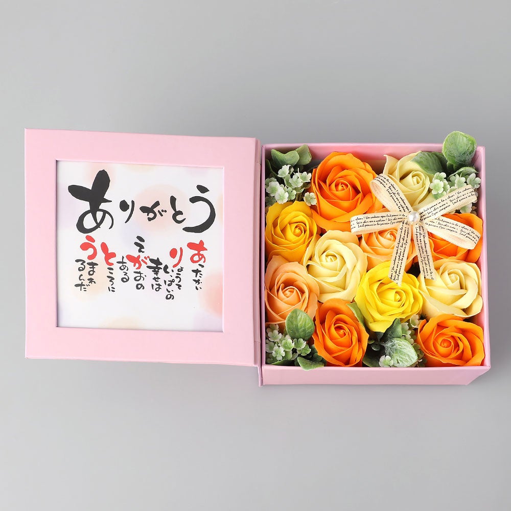 花の形の入浴剤を詰めたボックスアレンジに、「ありがとう」を伝えるポエムを添えました。