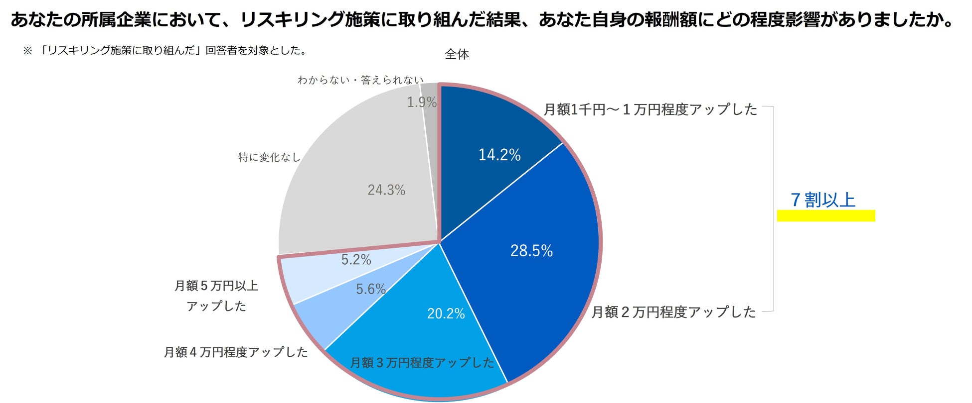 リスキリング施策の取り組んだ方の約70%が月額報酬がアップし、中には5万円以上アップした方も